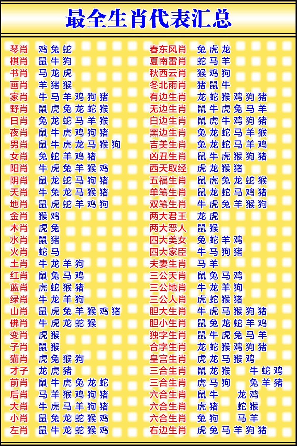 【日肖】兔龙蛇马羊猴 【夜肖】鼠牛虎鸡狗猪 | ||||||||||||||||||||||||||||||||||||||||||||||||||||||||||||||||||||||||||||||||||||||||||||||||||||